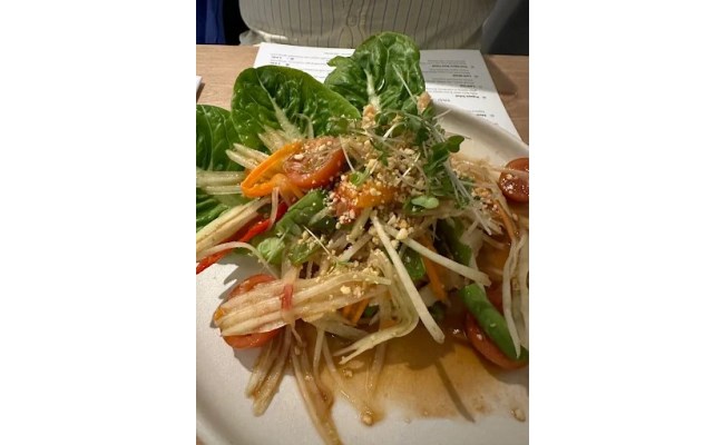 🦐🌶️🌶️Midly spicy, sweet & sour papaya salad combined with carrot, tomato, green bean, in chilli lemon dressing, topped with crushed peanuts.